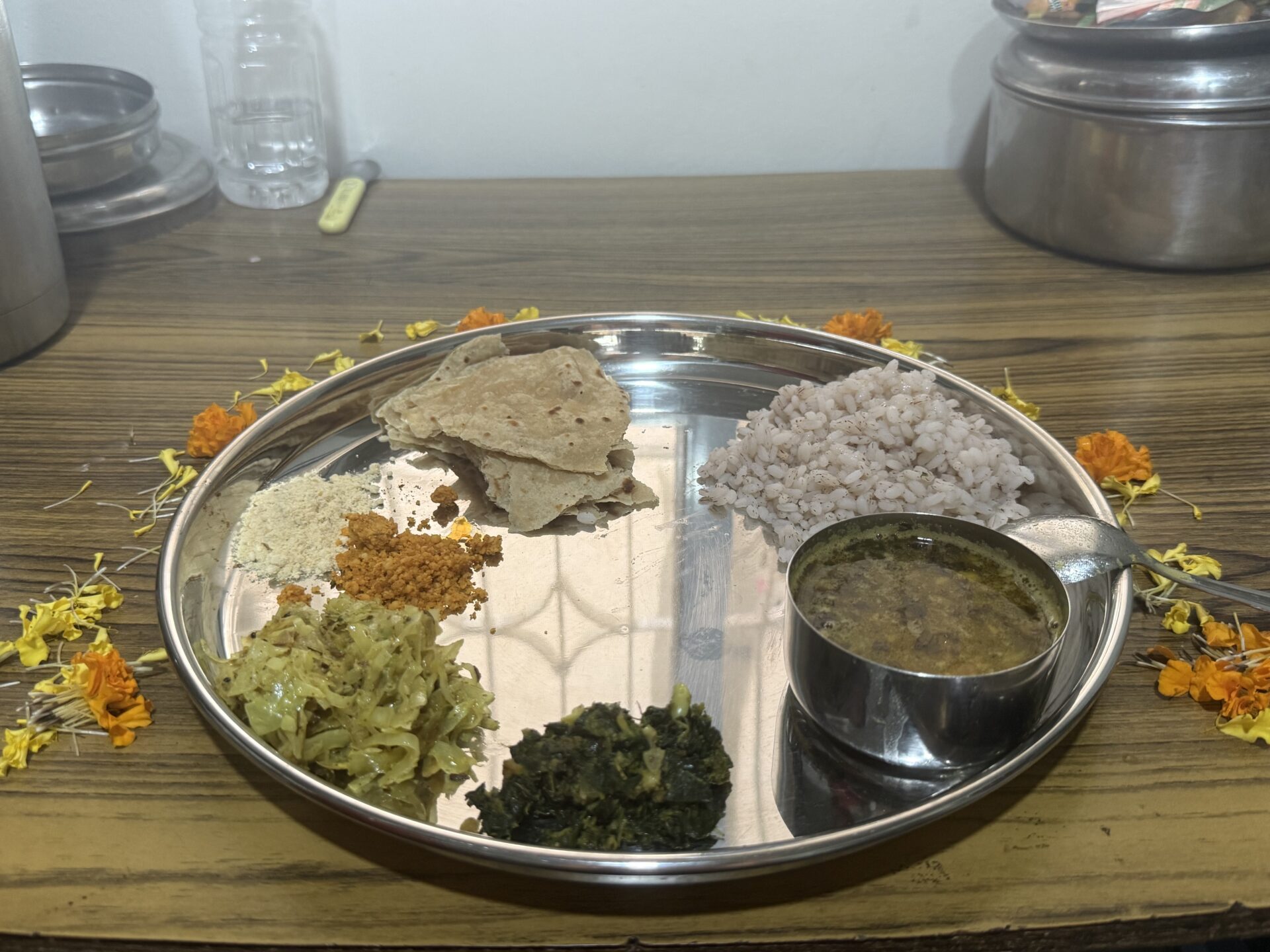 ネパールのダルバート同様、インドのベーシックな菜食プレートはこんな感じで、ダルカレー(写真右下)が中心にあり、それをライスやチャパティ(全粒粉のパン)そのほかの野菜のお惣菜、ピクルスやふりかけと共に食べるのが日常です。