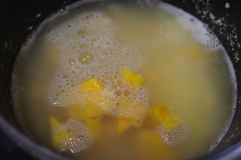 1、イエロームング豆を5倍の水とともに煮て、グズグズになるまで火入れする。カットしたかぼちゃを加えて、木べらで潰せるくらいまで茹でる。