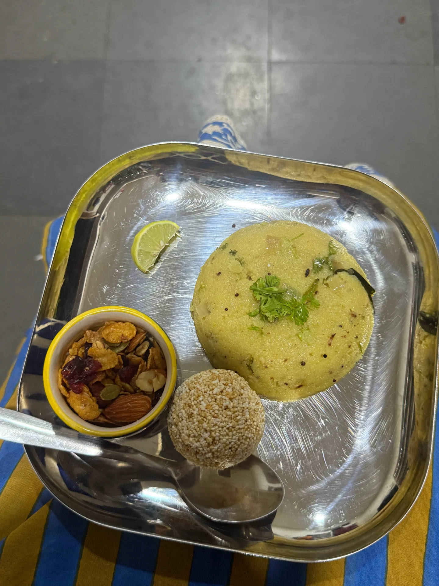 -ある日の朝ごはん / ベジタブルウプマ、アマランサスシードのお菓子、甘いミックスナッツ