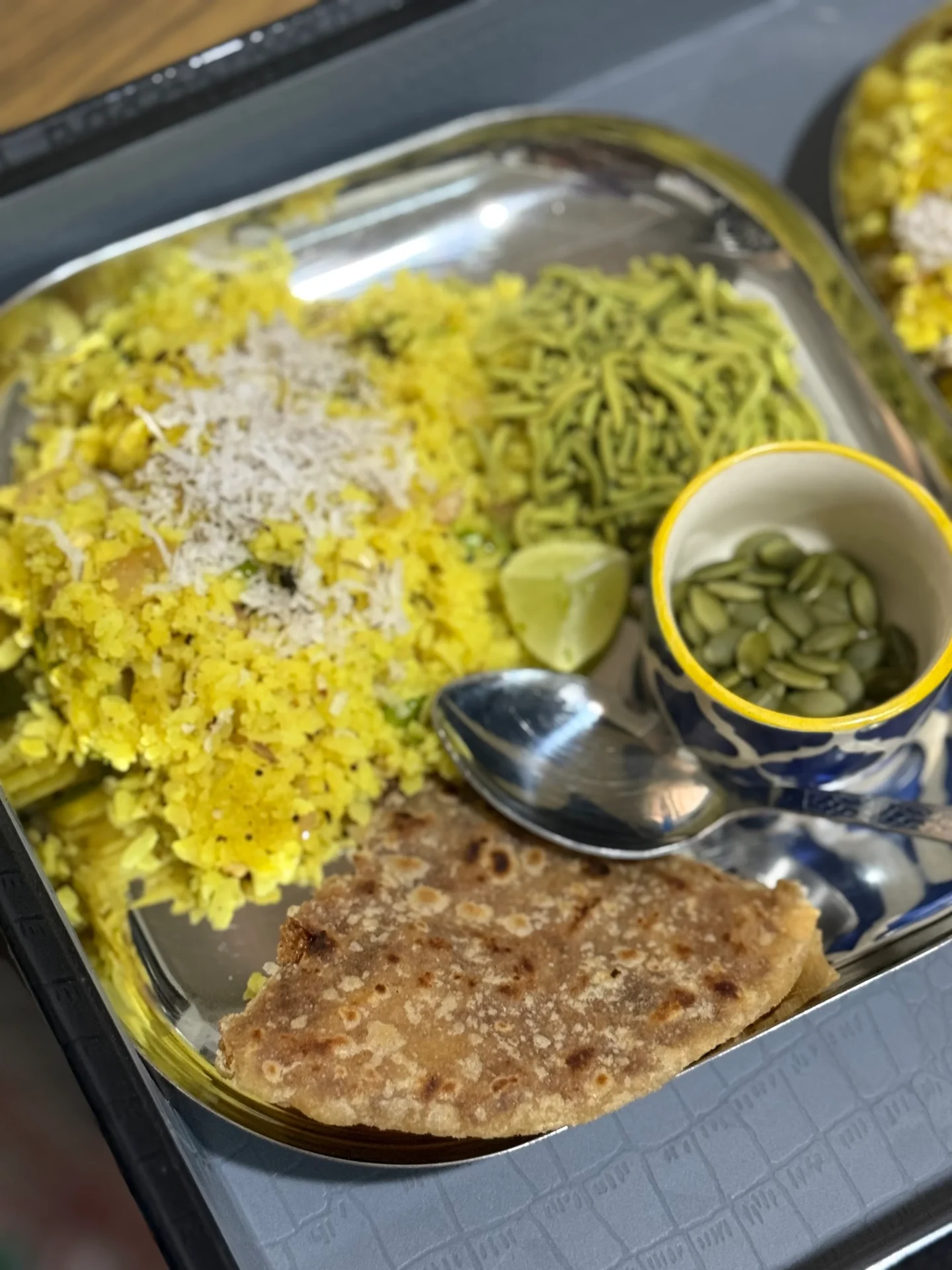 -ある日の朝ごはん / ポハ(ライスフレーク)、クンディチプーリ、ほうれん草のスナック、パンプキンシード