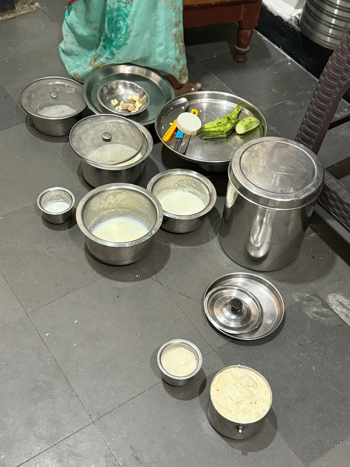 これは先生の家のキッチンにある牛乳たち。冷蔵庫がないので、こうして常温で保存し、1日に3回沸かし直して使用しています。(大丈夫なの?と思われそうですが大丈夫です)牛乳を常温で置いていると、自然とカードというヨーグルトのようなものができる。これを掬い取り、水で撹拌して作るのが、消化力をUPするドリンク「バターミルク」そしてさらにこのカードを集めて撹拌するとバターができるので、このバターから「ギー」を作ります。