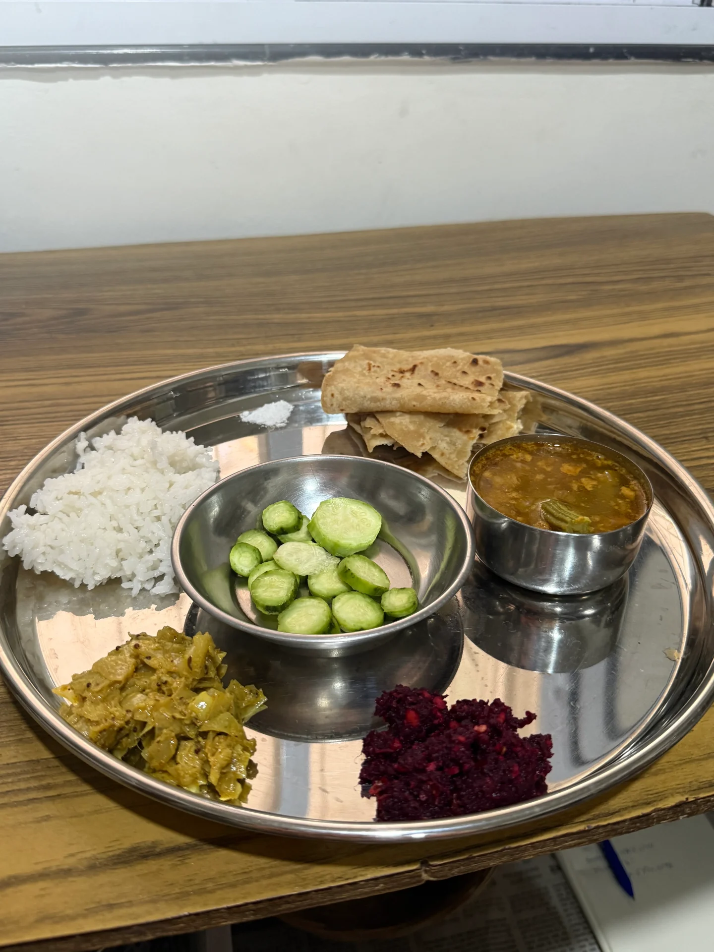-ある日の昼ごはん / バスマティ、チャパティ、きゅうり、サンバル、キャベツのサブジ、ビーツのトーラン