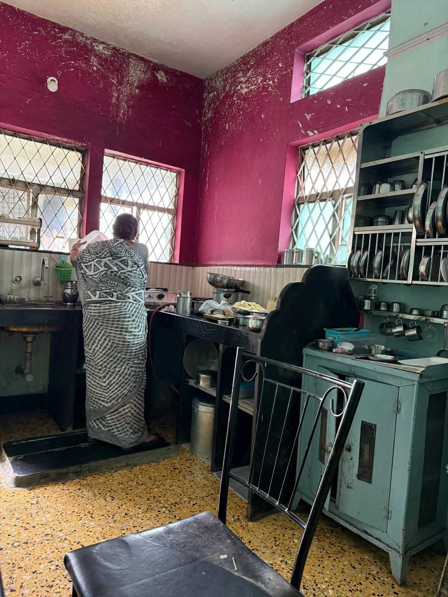 あまりに尊い存在すぎて、前からの写真は撮るのが憚られたので、後ろ姿ですみません。そしてこちらのキッチンは、ご実家の方のキッチン。つまりお父様の治療院のキッチンです。ここでも料理をするお母さん。