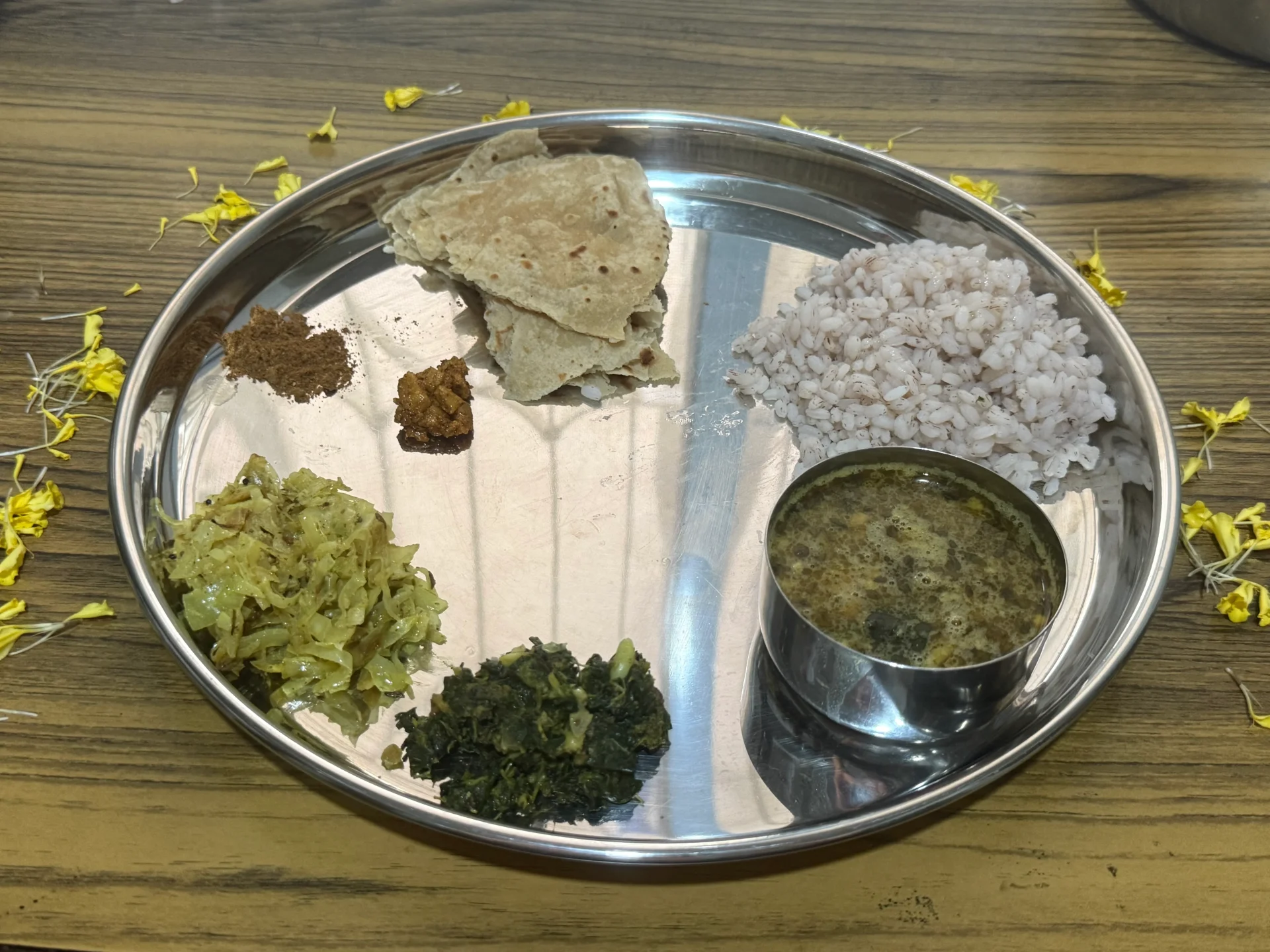 -ある日の昼ごはん / 赤米、チャパティ、ピーナッツのポディ、キャベツのサブジ、アマランサスの葉の炒め物、ダル