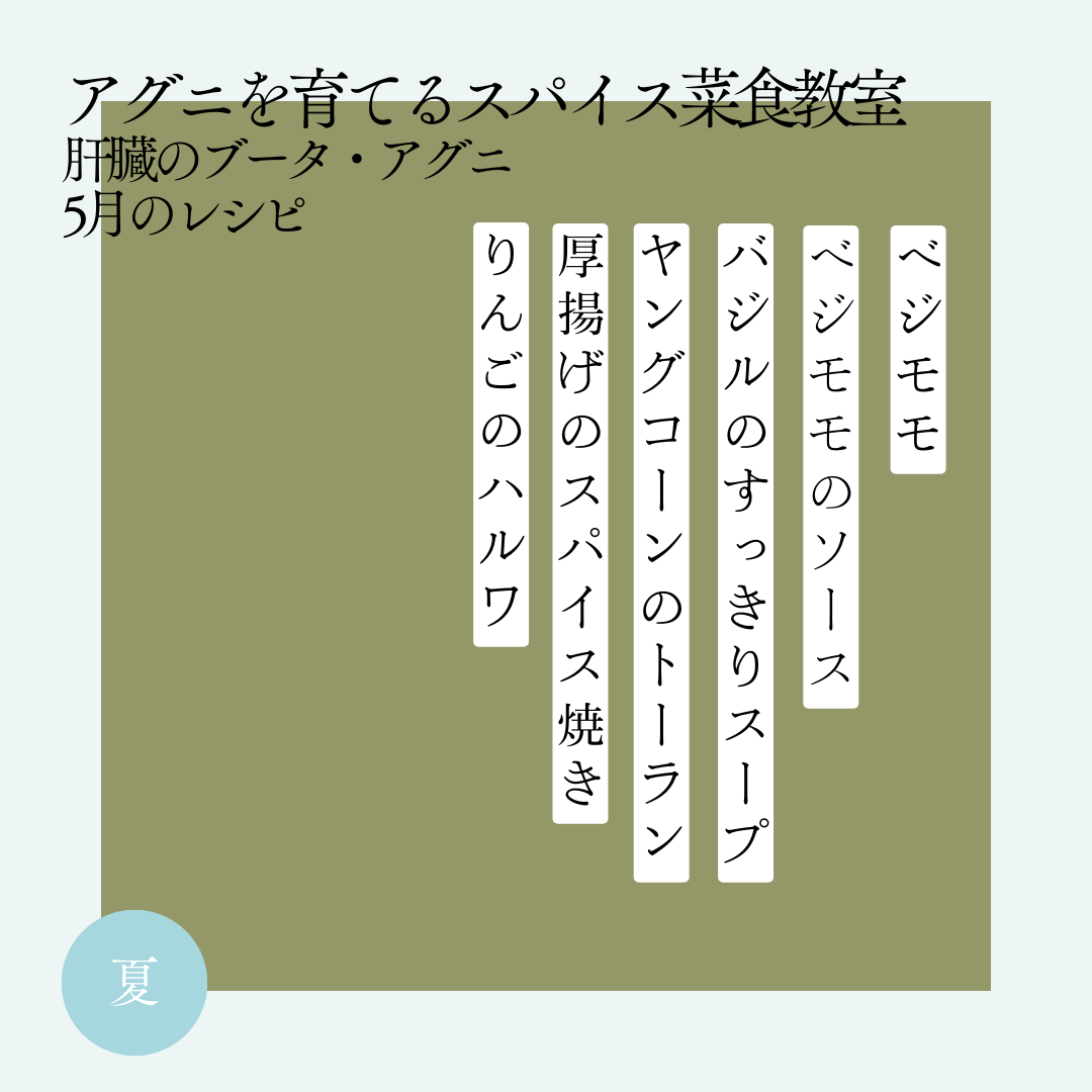 フレッシュなハーブが美味しい季節です。ネパール料理から着想を得たベジ仕様のモモ(餃子)や初夏のヤングコーンを使ったレシピなど、季節の素材を活かしたメニューをご紹介します。