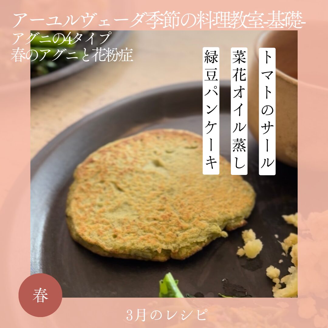 春の変化に寄り添う「アーユルヴェーダ季節の料理教室」3月クラス。消化力(アグニ)と未消化物(アーマ)の関係を座学で学び、ターメリックミルクや緑豆パンケーキなど季節のデトックスレシピを実践します。