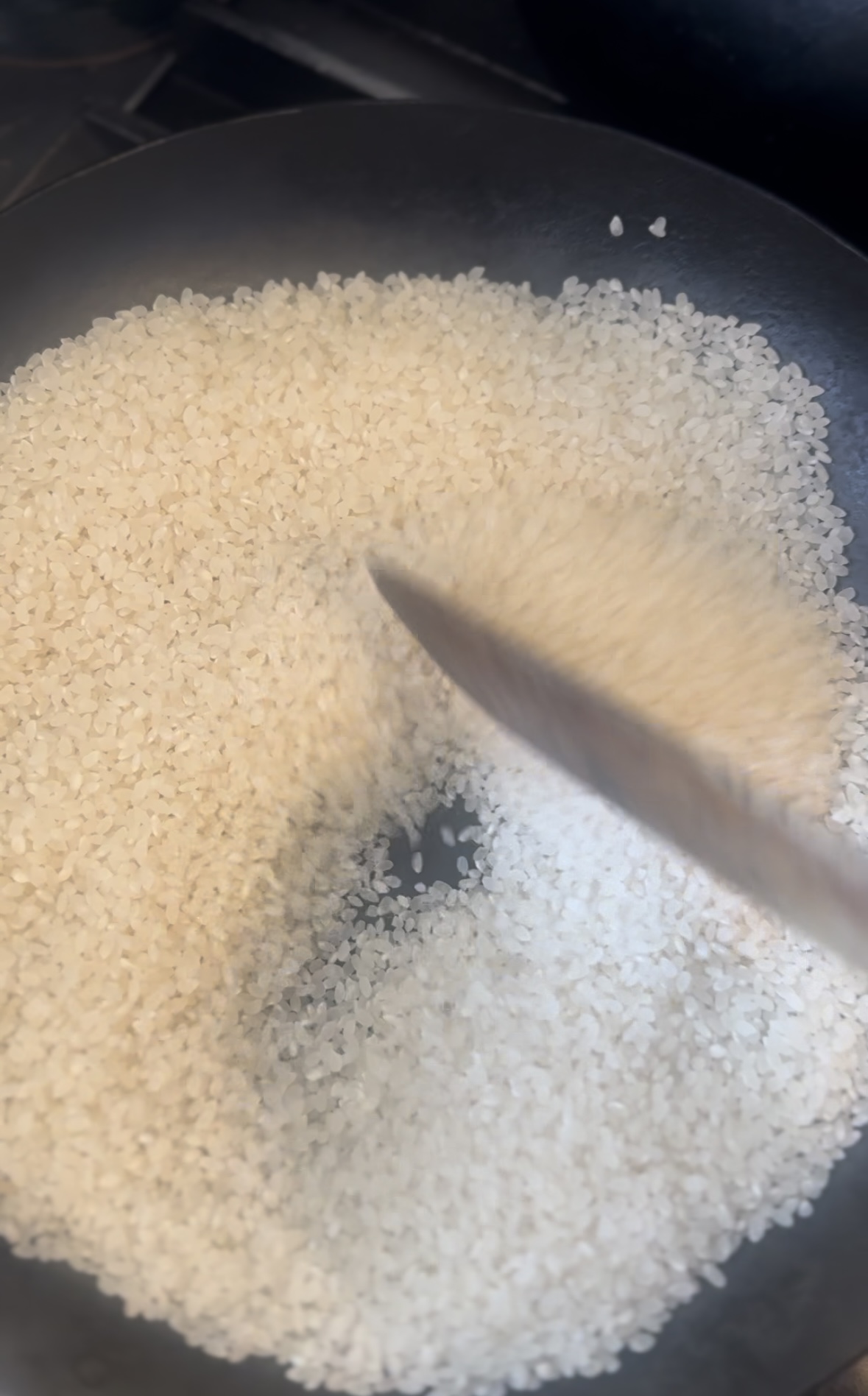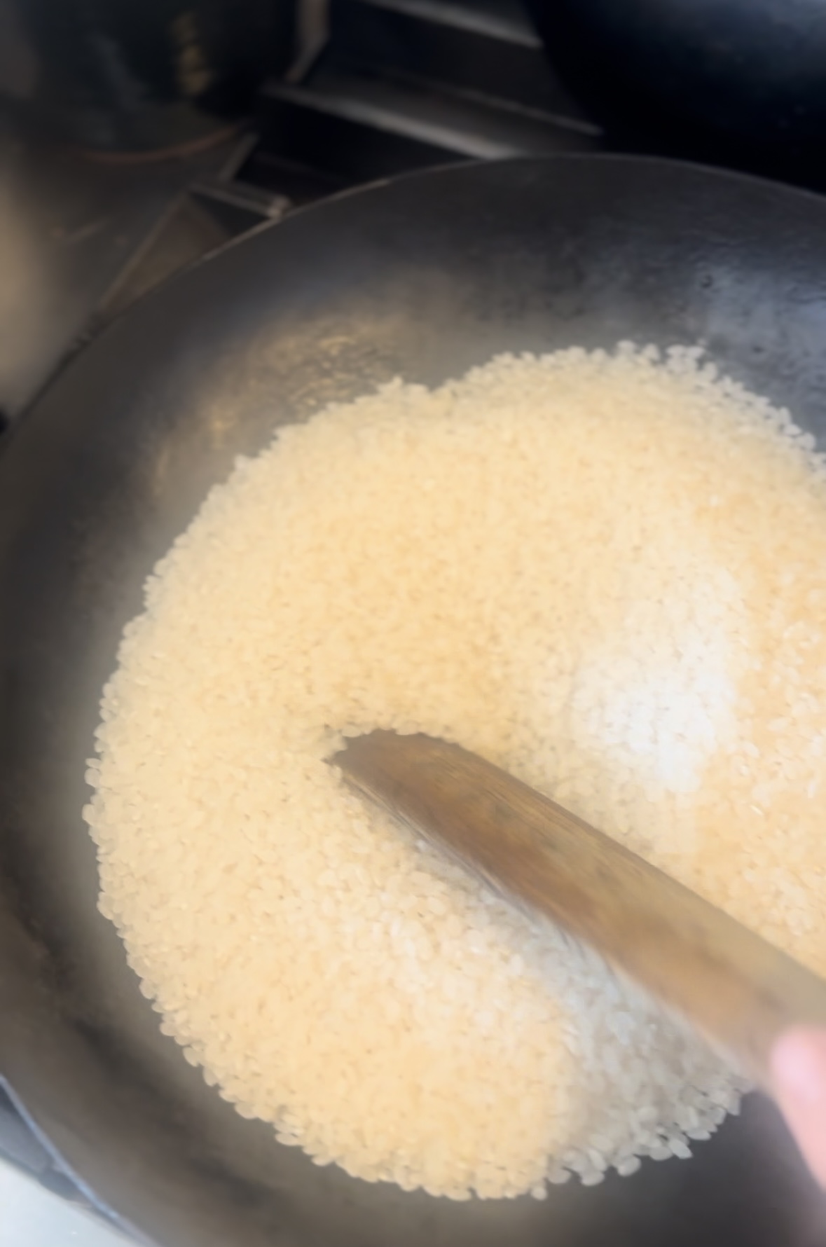この写真はお店用なので6合炒ってますが、お家で家族で食べるご飯の量で、1-2合であれば、ほんの5分ほど炒ればできるのではないでしょうか?(※ガス台の条件によるので、必ず木べらを持つ手が軽くなるまで炒るようにしてください)