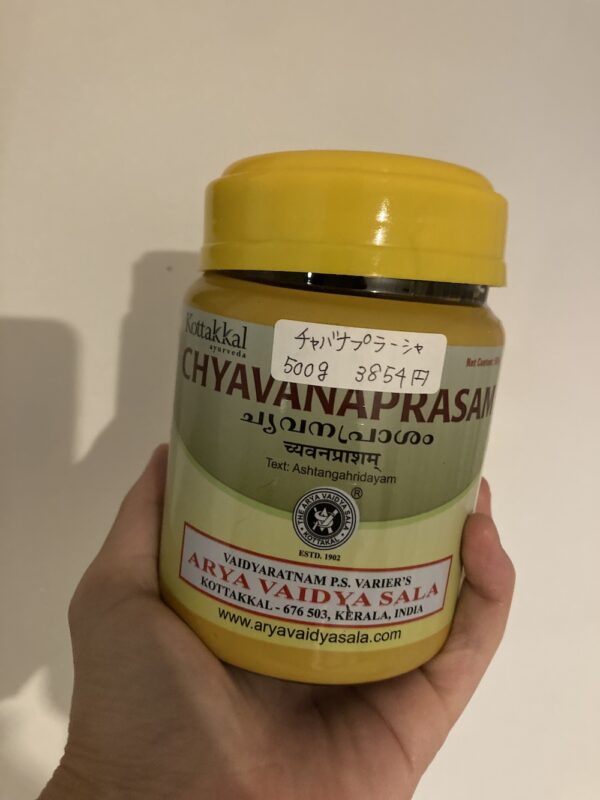 フレッシュのアムラは日本でも春〜初夏の頃にインド食材店で出回り、それを舐め剤(ジャム)である「チャバナプラーシュ」にして1年を通して食べることが薦められます。写真は祐天寺のハタイクリニックで購入した既製品。チャバナプラシュはオンラインでも購入できます。