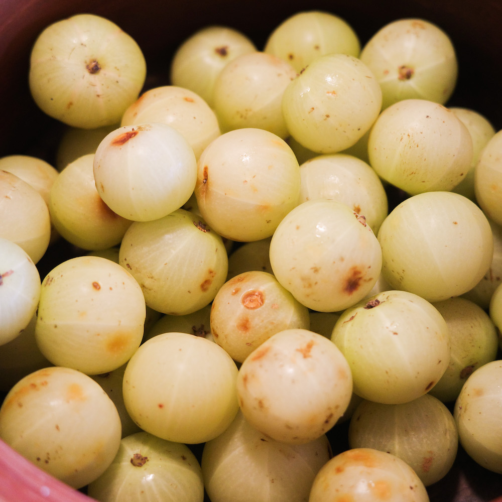 手に入ったらシロップにするのが簡単。シロップが出来上がった後の実は、さらに砂糖づけして干すと柔らかいアムラ飴みたいな感じになります。
