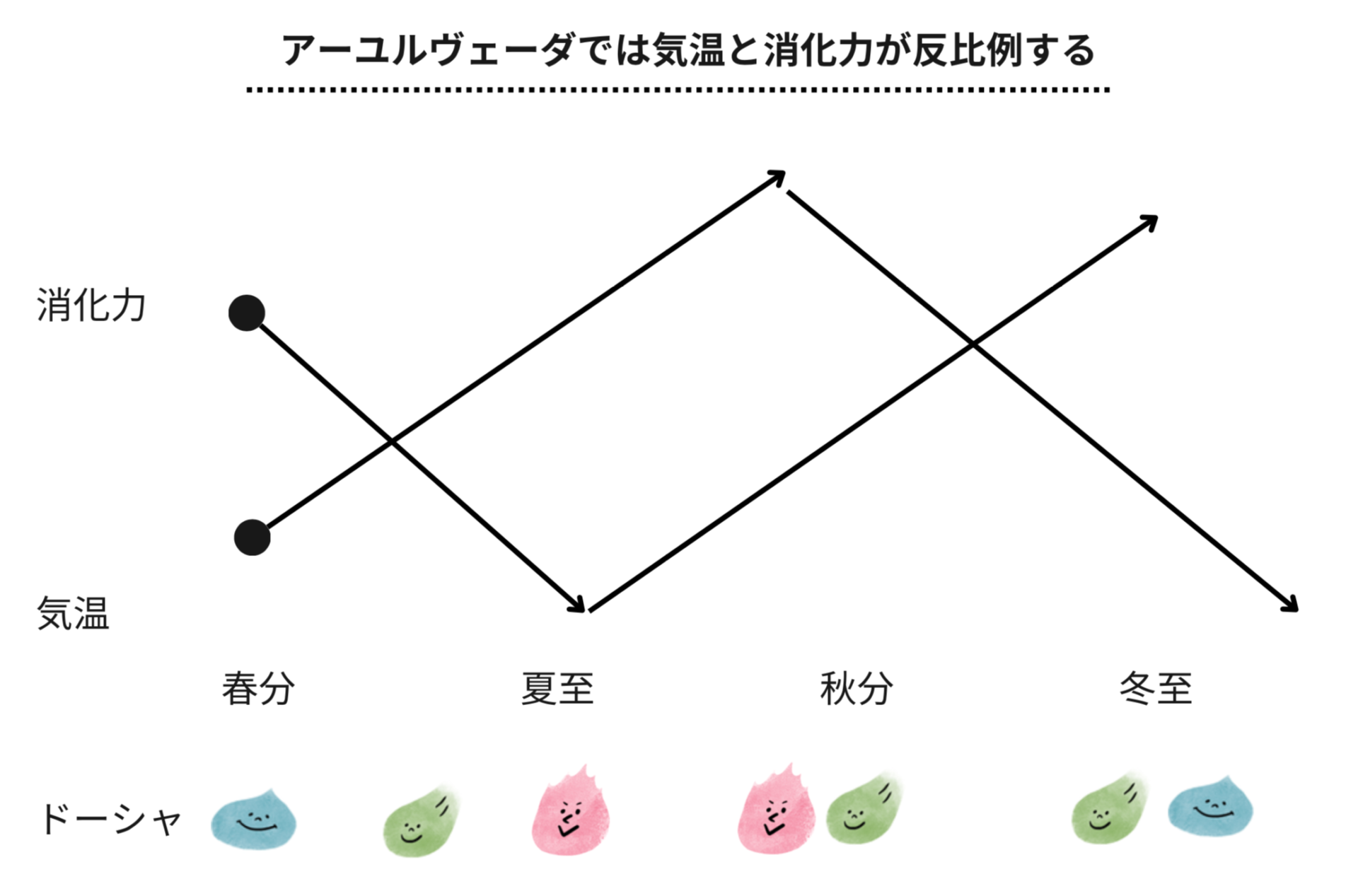 そして、アーユルヴェーダでは「体力」と「消化力」はイコールの関係性。体力が一番高い冬は消化・代謝の力も高まり、体力が一番低い夏は消化・代謝の力は弱まります。